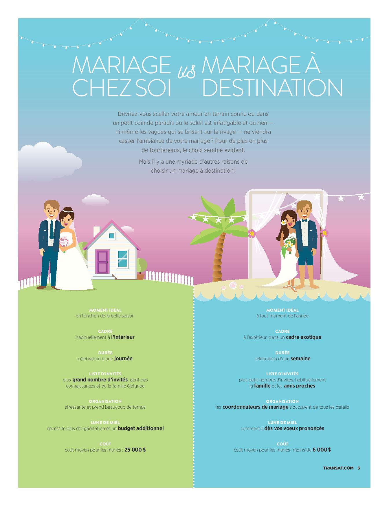 Un mariage dans le sud est un parfait combiné pour la célébration et la lune de miel en même temps. En plus, cela vous permet d’avoir votre famille et vos amis à vos côtés et de vivre un voyage de groupe. Il est souvent plus intime qu’un mariage au Québec et aussi beaucoup moins coûteux. Un mariage au Québec peut coûter facilement plus de 15 000$ alors qu’un mariage dans le sud peut coûter moins de 5 000$ pour la célébration et le voyage inclusivement. Plusieurs chaînes hôtelières offrent des forfaits mariages GRATUIT si vous respectez quelques conditions. Contactez une de nos spécialistes mariages pour davantage d’informations.